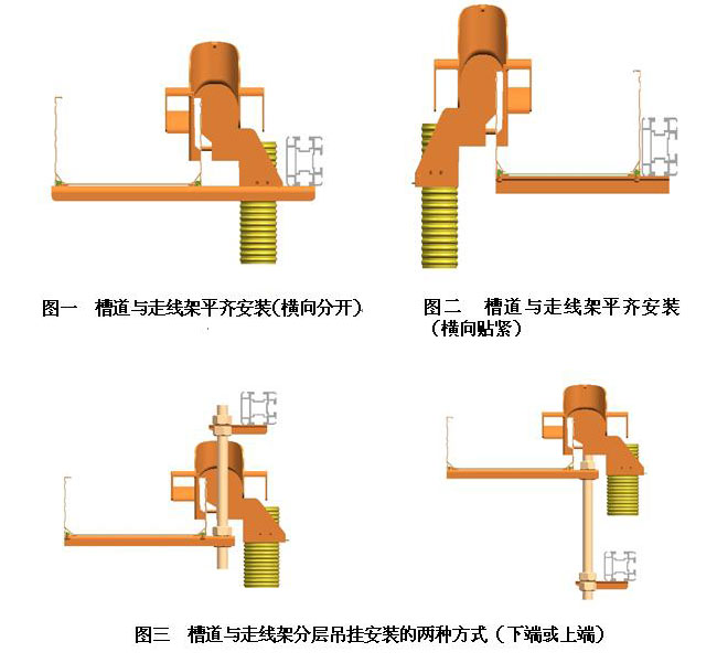 光纤槽道有四种安装方式:槽道底面与走线架底面平齐(分与走线架横向分开和贴紧两种情况)以及装在走线架上端、装在走线架下端。200毫米以下安装方式见图一~图三。250和300毫米宽的槽道安装方式是在图二和图三的基础上,另外每隔一米在远离走线架的一端增加一组吊挂。